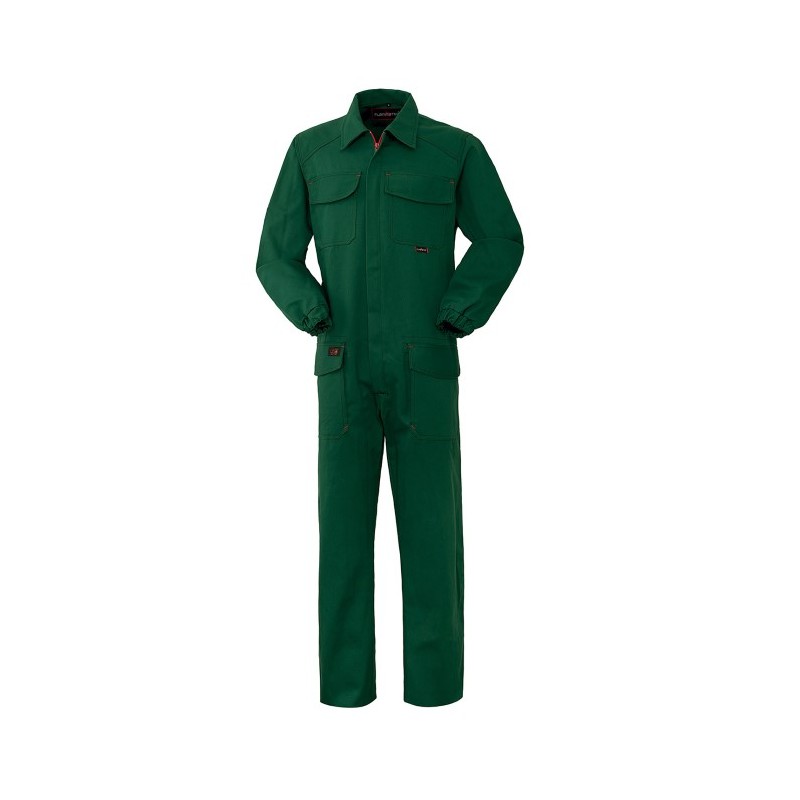 Tuta da lavoro con chiusura centrale con zip a doppio cursore coperta da patella. Due taschini applicati al petto chiusi con aletta e velcro, due tasche applicate chiuse con aletta e velcro con soffietto laterale interno, elastico in vita posteriore, elastico ai polsi, carr