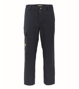 Pantalone da lavoro con chiusura alla patta con zip e bottone automatico nascosto, passanti in vita ed elastico ai fianchi. Due tasche anteriori interne, tasca posteriore applicata a destra chiusa con aletta e velcro, tascone laterale chiuso con aletta e velcro applicato su gamba destra. Etichetta jacquard con pittogrammi cucita sul tascone, travette varie di colore giallo.