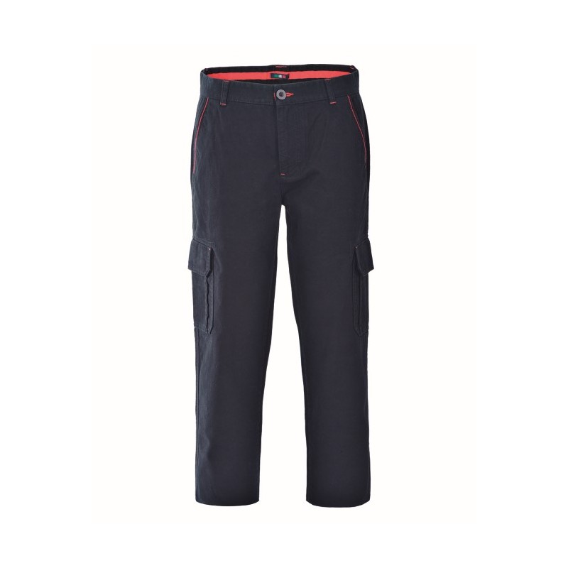 Pantalone da lavoro con elastico ai fianchi interno regolabile, chiusura alla patta con cerniera e bottone in cintura, travette varie di colore rosso. Due tasconi laterali con soffietto centrale chiusi con aletta e punti velcro, due tasche anteriori interne con cucitura di colore rosso, una tasca posteriore applicata a destra chiusa con aletta e punti velcro, una tasca posteriore applicata a sinistra chiusa con bottone tradizionale.