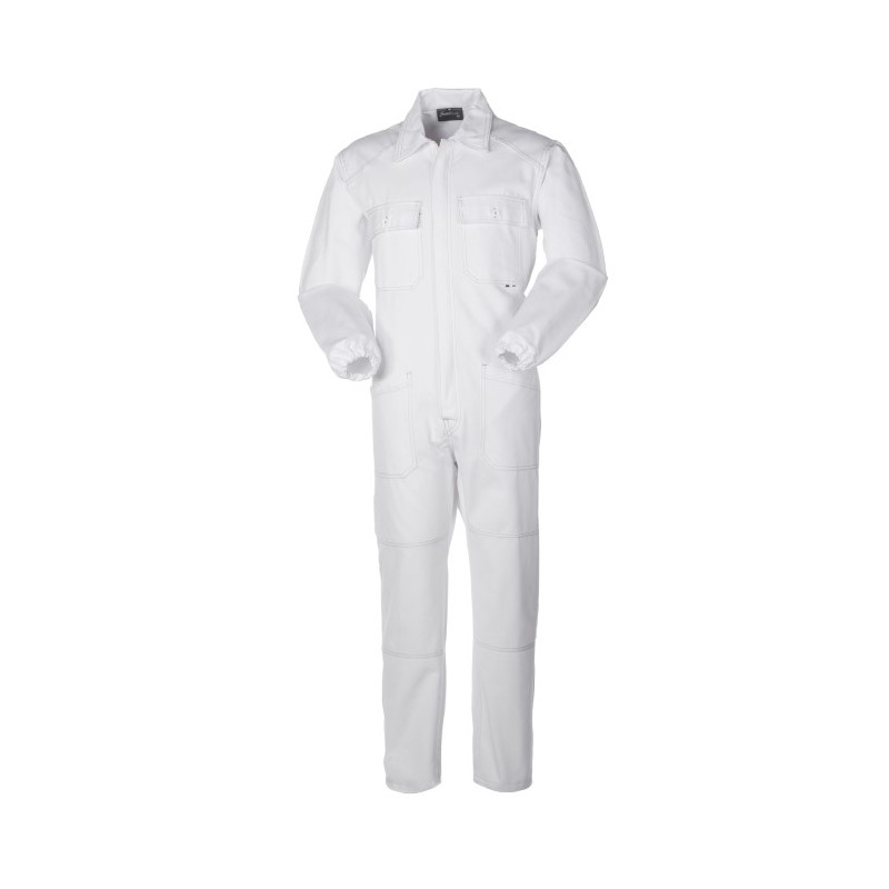 Tuta da lavoro con elastico in vita posteriore e chiusura centrale con zip a doppio cursore coperta da patella. Due taschini al petto chiusi con aletta e bottone, due tasche inferiori, una tasca posteriore chiusa con bottone e un porta metro. Polsi con elastico, cuciture di colore a contrasto. *** TAGLIE 4XL DISPONIBILE SOLO PER I COLORI 01 BLU E 12 GRIGIO ***