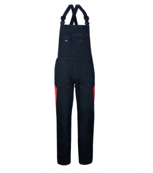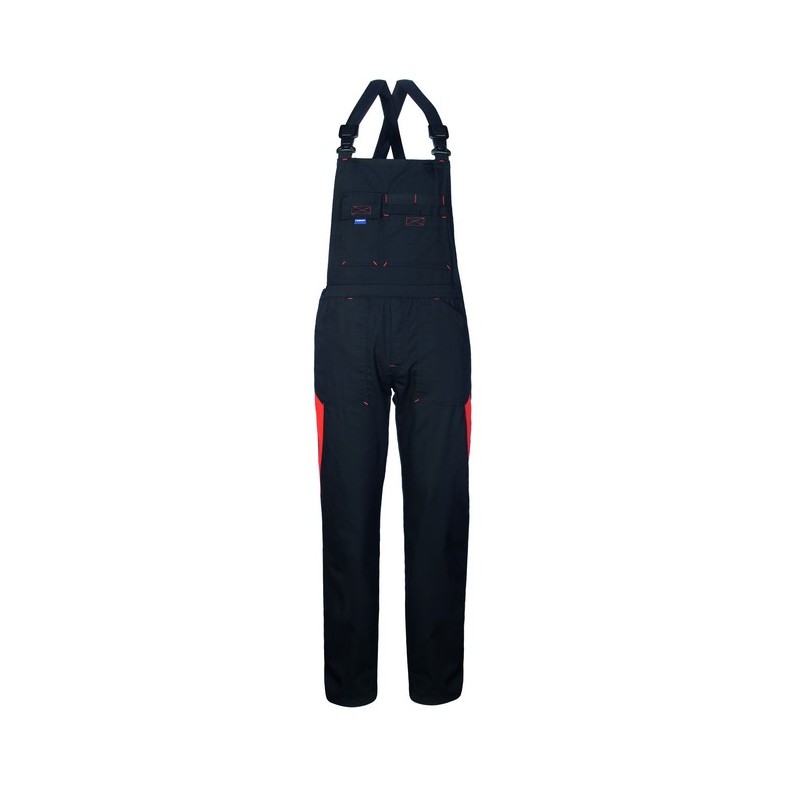 Pettorina da lavoro con bretelle con elastico interno, chiusura alla patta e cerniera. Un tascone e un portacellulare al petto, due tasche anteriori applicate, una tasca posteriore applicata a destra chiusa con aletta e velcro, un porta metro su gamba destra. Elastico in vita posteriore, apertura laterale a destra chiusa con bottoni, salva reni con elastico interno, inserti e travette di colore a contrasto.
