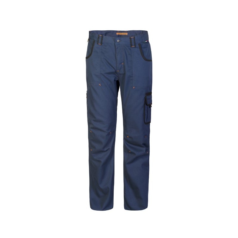 Pantalone da lavoro con elastico in vita regolabile, chiusura alla patta con cerniera e bottone alla cintura, passanti in cintura rinforzati con doppio tessuto. Due tasche anteriori applicate, un tascone laterale applicato a sinistra chiuso con aletta e velcro, due tasche posteriori applicate chiuse con aletta e velcro, portametro e taschino chiuso con velcro applicati lateralmente a destra.