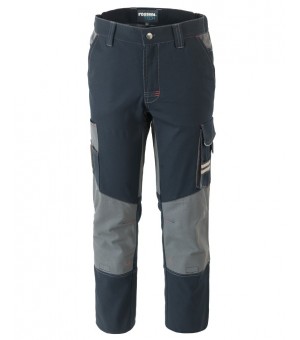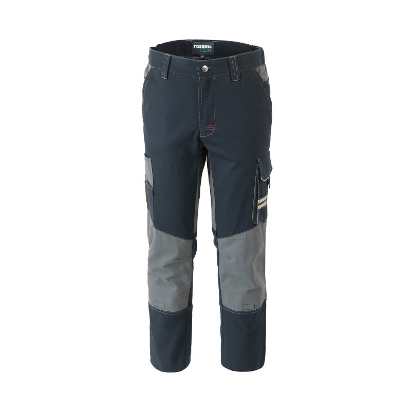 Pantalone da lavoro multistagione in canvas stretch, con porta ginocchiere in tessuto Ripstop, elastici laterali in vita e passanti, chiusura con cerniera in plastica e bottone. Doppie tasche anteriori, due tasche laterali di cui una tripla con inserto Ripstop con velcro portabadge, portapenne e inserto porta attrezzi, una doppia tasca a soffietto con chiusura velcro e porta attrezzi, due tasche posteriori chiuse con aletta e velcro. Rinforzi in tessuto Ripstop con triple cuciture al cavallo, alle ginocchia e posteriori, inserti e travette a contrasto. CONFEZIONATO IN SCATOLA SINGOLA
