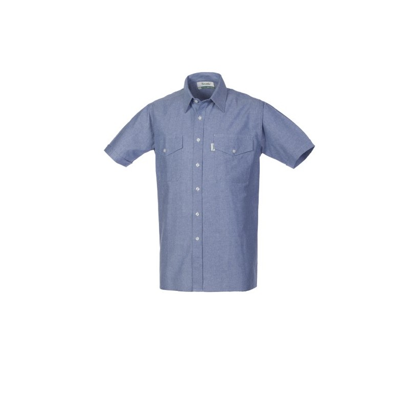 Camicia con chiusura centrale con bottoni, manica corta con risvolto. Due taschini al petto di cui uno con portapenne chiusi con aletta e bottone.