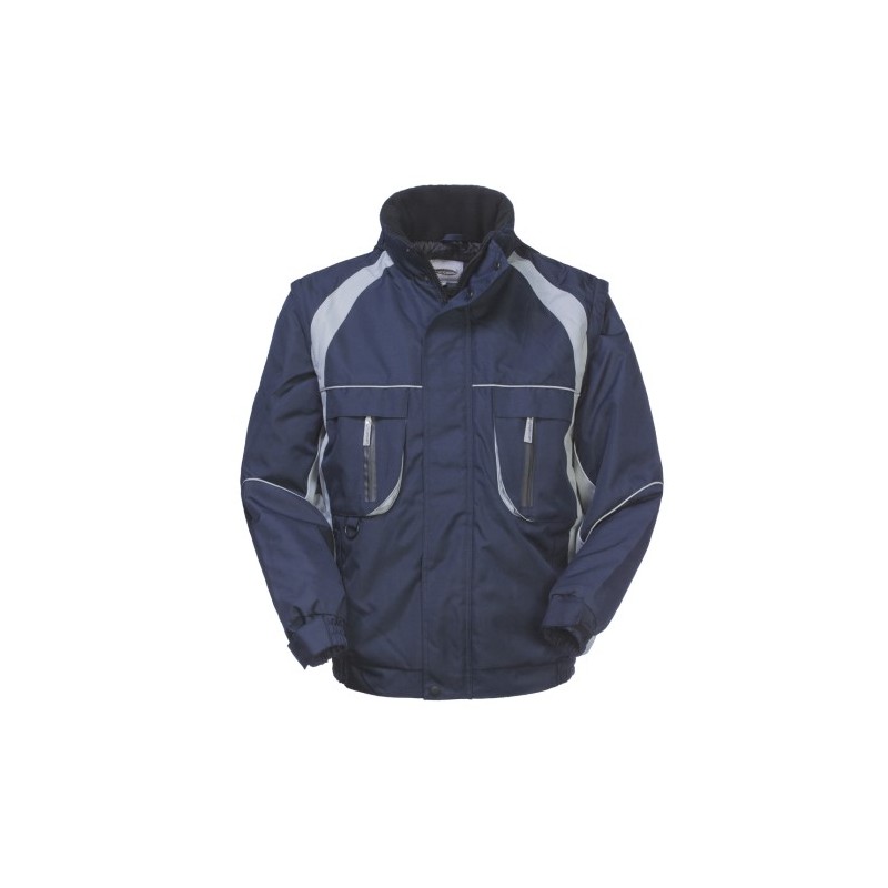 Giubbotto imbottito con cerniera coperta da patella chiusa con velcro e bottoni automatici, cappuccio con coulisse inserito nel collo in pile chiuso con velcro, maniche staccabili. Taschini con soffietto laterale applicati al petto chiusi con cerniera verticale e aletta, taschino interno al petto sinistro chiuso con velcro, tasche inferiori a filetto chiuse con patella antivento. Polsi al fondo manica con elastico regolabili con velcro, elastico e inserti di colore a contrasto lungo i fianchi, spalle anteriori e posteriori, maniche con profilo rifrangente grigio.