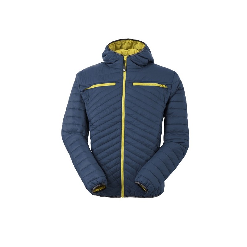 Giubbotto imbottito con chiusura anteriore con cerniera in plastica e con cappuccio. Due taschini al petto chiusi con cerniera, due tasche inferiori a filetto chiuse con bottone automatico, due tasche interne e ulteriore taschino applicato sopra la tasca interna sinistra chiuso con velcro. Rifinito con bordo elastico personalizzato Rossini al fondo manica, in vita, su collo e cappuccio.