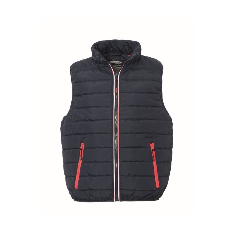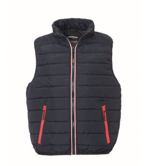 Gilet imbottito con chiusura anteriore con cerniera, giromanica e fondo profilati con sbieco elasticizzato, due tasche inferiori a filetto chiuse con cerniera.