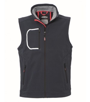 Gilet realizzato in tessuto Softshell a tre strati, chiusura con zip centrale, foro di aerazione sulla schiena. Un taschino a filetto al petto destro chiuso con zip verticale e profilo rifrangente, due tasche inferiori a filetto chiuse con zip. 8000 mm WP