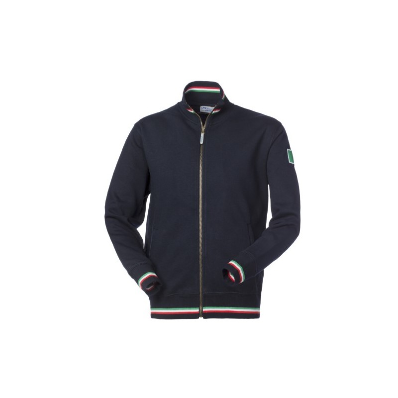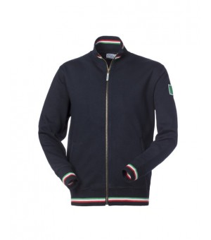 Felpa con chiusura centrale con cerniera in ottone brunito, parasudore interno al collo e ricamo posteriore tricolore sotto il collo. Polsi, collo e fascia girovita in maglia elastica con inserti colorati, due tasche inferiori a filetto e scudetto tricolore applicato sulla manica sinistra.