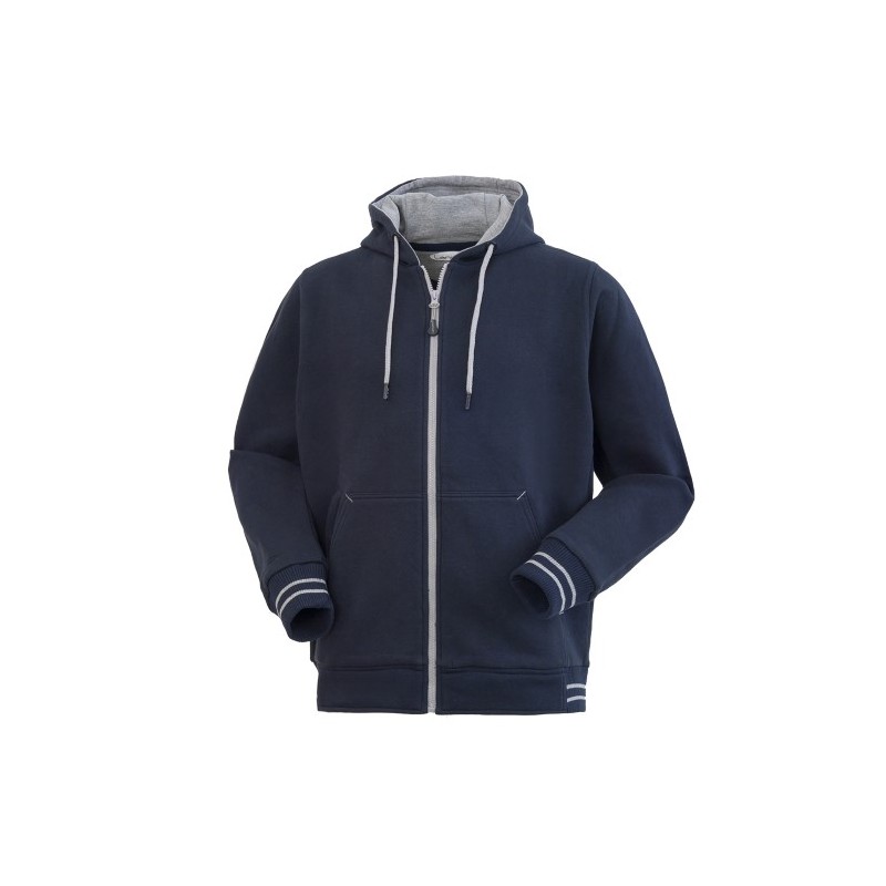 Felpa con chiusura centrale con cerniera in plastica, cappuccio chiuso con cordino, interno del cappuccio di colore a contrasto, parasudore interno al collo. Polsi e fascia in vita in maglia elastica con inserti di colore a contrasto e un taschino a filetto inferiore a destra chiuso con cerniera, due tasconi anteriori.