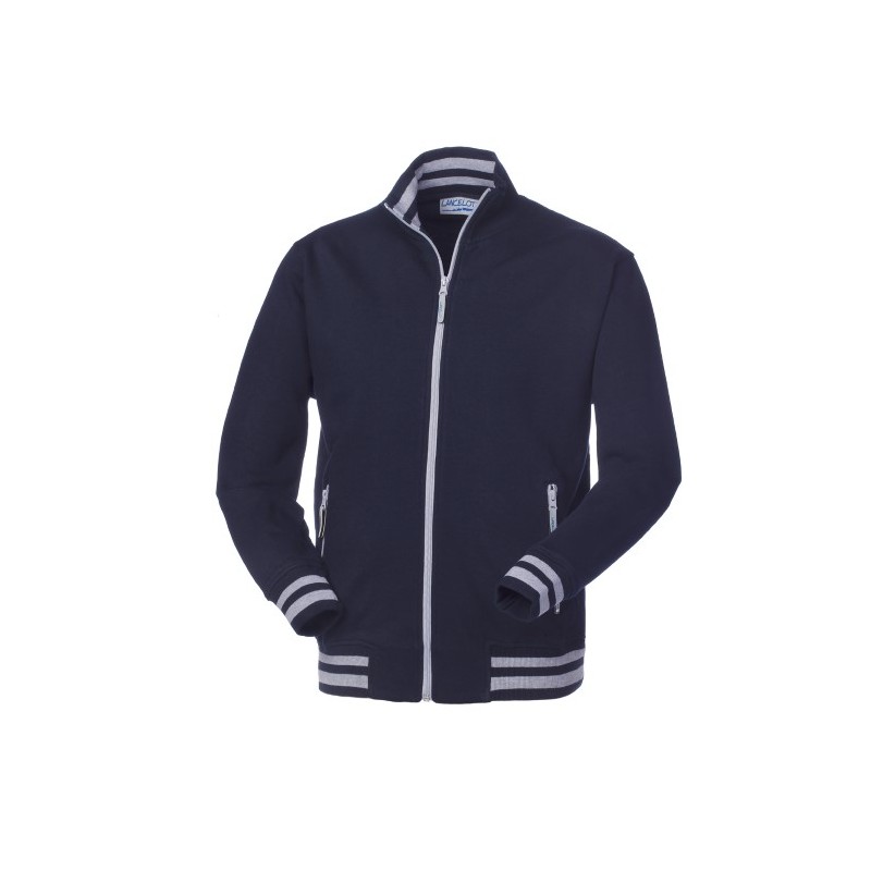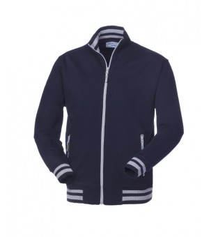 Felpa con chiusura centrale con cerniera in plastica, collo in maglia elastica di colore in tinta con inserti di colore a contrasto interno, parasudore interno al collo. Polsi e fascia girovita in maglia elastica con inserti di colore a contrasto, due tasche inferiori a filetto chiuse con cerniera in plastica.