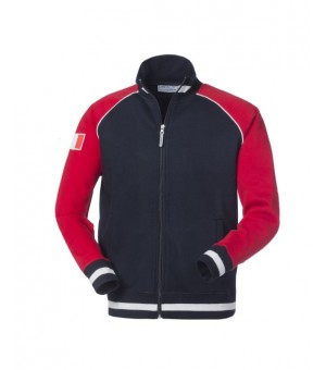 Felpa con chiusura centrale con cerniera, parasudore interno al collo, maniche raglan di colore a contrasto profilate con coda di topo bianca. Polsi, collo e fascia in girovita in maglia elastica, due tasche inferiori a filetto, scudetto tricolore applicato su manica destra.