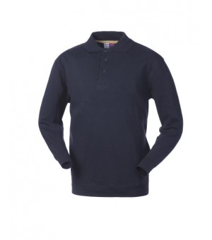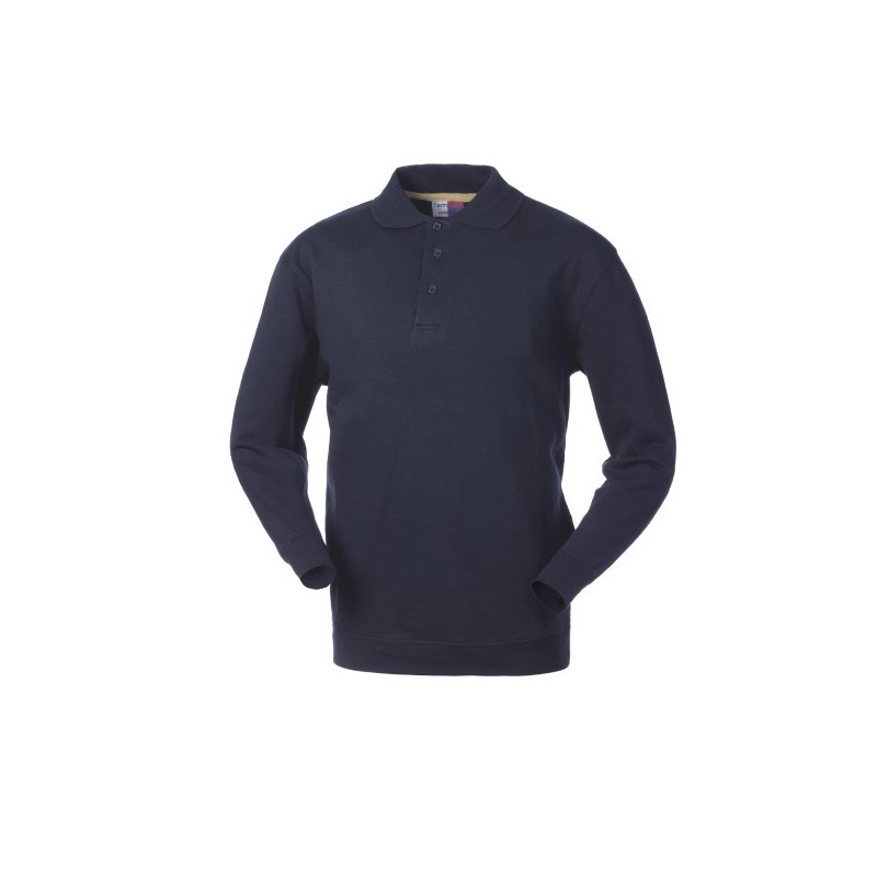 Felpa con collo a polo chiuso con tre bottoni, parasudore interno al collo, giromaniche dritto. Polsi e fascia girovita in maglia elastica a costine 2/1 con doppie cuciture.