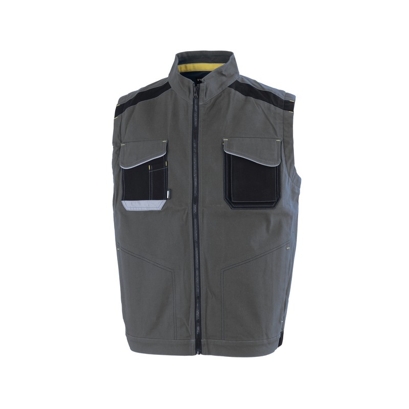 Gilet da lavoro in canvas stretch con collo alla coreana e chiusura anteriore con zip. Una tasca applicata al petto destro con inserto rifrangente, con portapenne e chiusa con aletta e velcro, una tasca applicata al petto sinistro con patella removibile per facilitare il ricamo chiusa con aletta e velcro, due tasche inferiori interne. Giromanica con inserto in maglia elastica, profilo rifrangente inserito nelle alette delle tasche e nel carr
