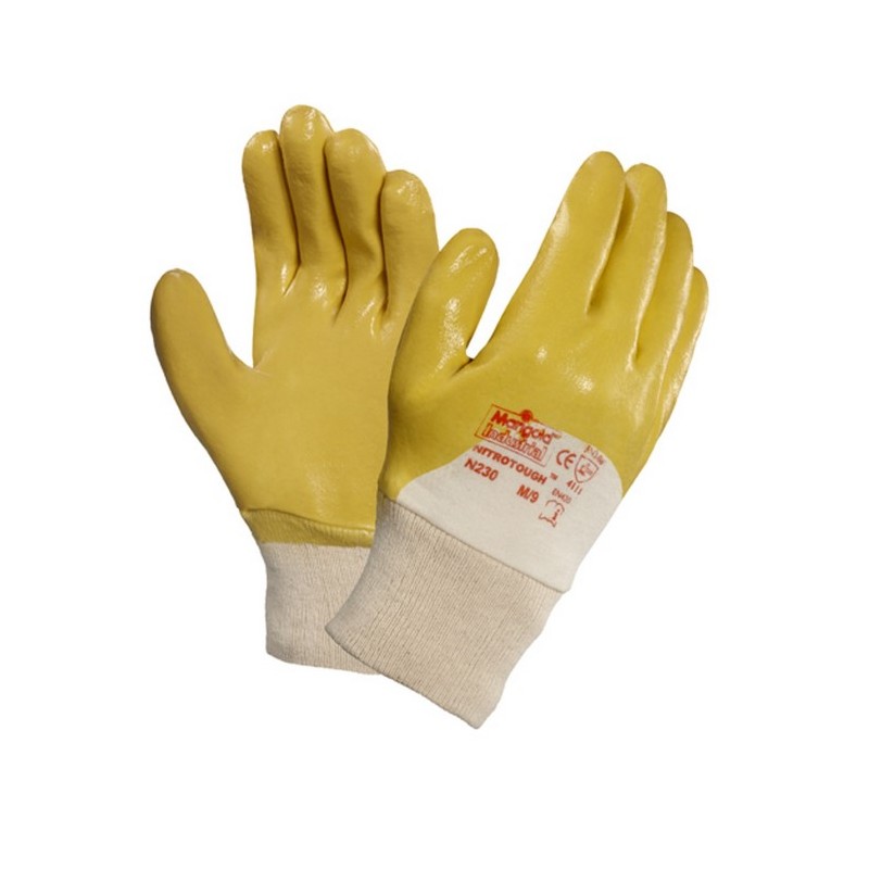 Guanto tagliato e cucito, fodera in cotone interlock, rivestimento in nitrile, polso lavorato a maglia, lunghezza 260 mm.