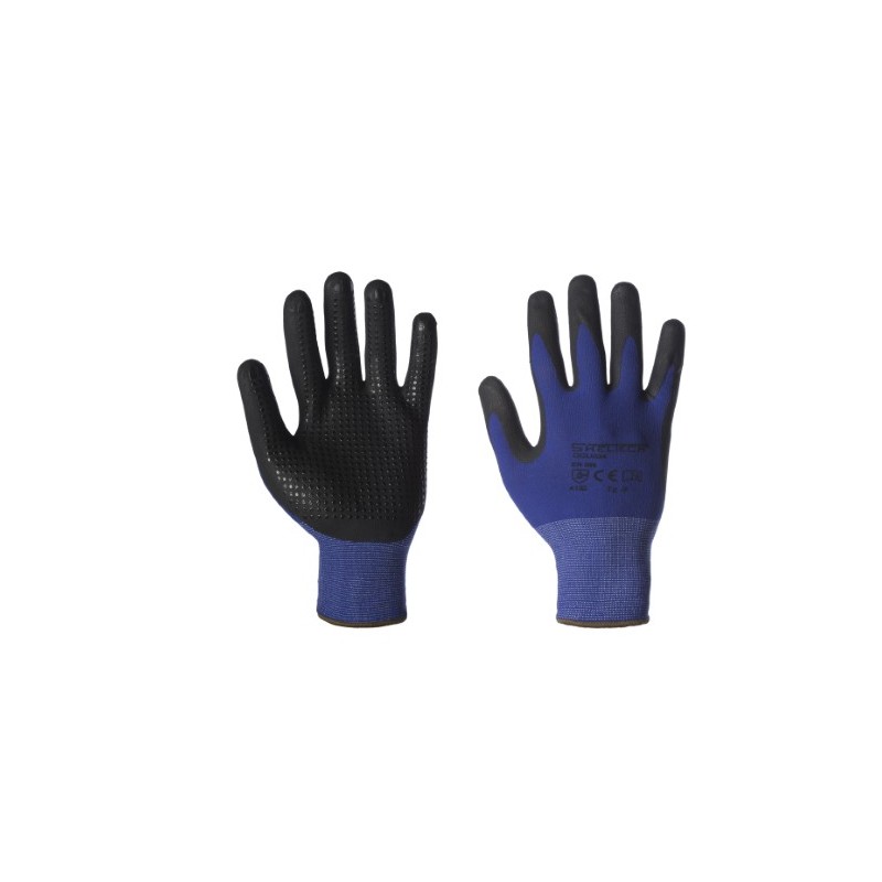 Guanto a filo continuo in nylon con rivestimento in nitrile su palmo e dita, palmo puntinato, sensibile, senza cuciture. APPLICAZIONI: Meccanica di precisione, elettronica, montaggi fini, rubinetteria, tessile, cavi, ecc. ***Articolo fine serie, sostituito da GGC024 (stesso guanto, ma confezionato con cavallotto)***