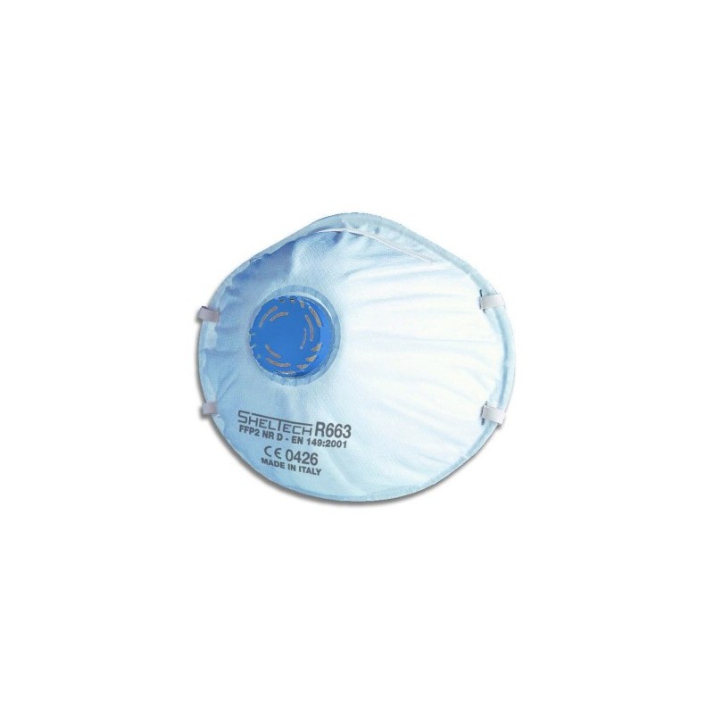 Facciale filtrante per polveri, fumi e nebbie, a forma di conchiglia in tessuto non tessuto PP, con stringinaso in plastica rinforzata con morbida guarnizione di tenuta in schiuma di gomma, elastici in gomma di sintesi e valvola di esalazione. Massimo livello di utilizzo fino a 10 volte in TLV. APPLICAZIONI: industria del cemento, vetro, edilizia, tessile, ceramica, mineraria, fonderie e metalmeccanica.