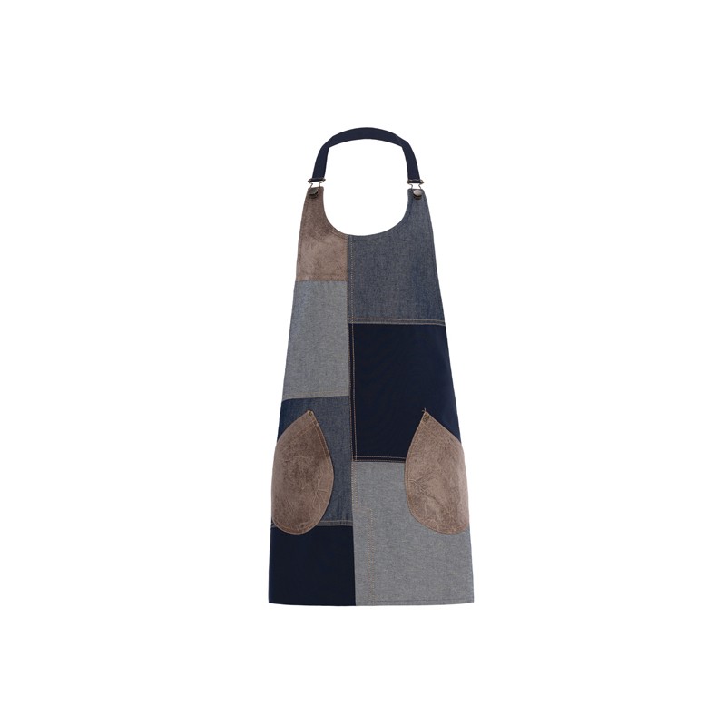 19P01H073 Stile sorprendente per questi grembiuli in denim patchwork blue, sia nella versione uomo che in quella donna. Il tessuto denim usato al rovescio, abbinato a inserti e tasche in alcantara, gli conferiscono un aspetto autentico e contemporaneo. Le cuciture a contrasto e la metalleria in ottone invecchiato illuminano e rendono il capo davvero ricercato. Tipica l