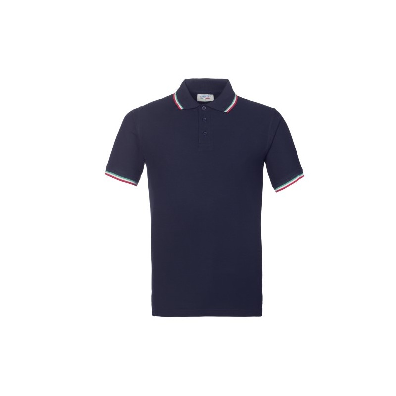 Polo mezza manica con fascia parasudore nella parte posteriore del collo, profili tricolore al collo, chiusa con tre bottoni, giromanica a costina con profili tricolore, spacchetti laterali al fondo con inserto tricolore.